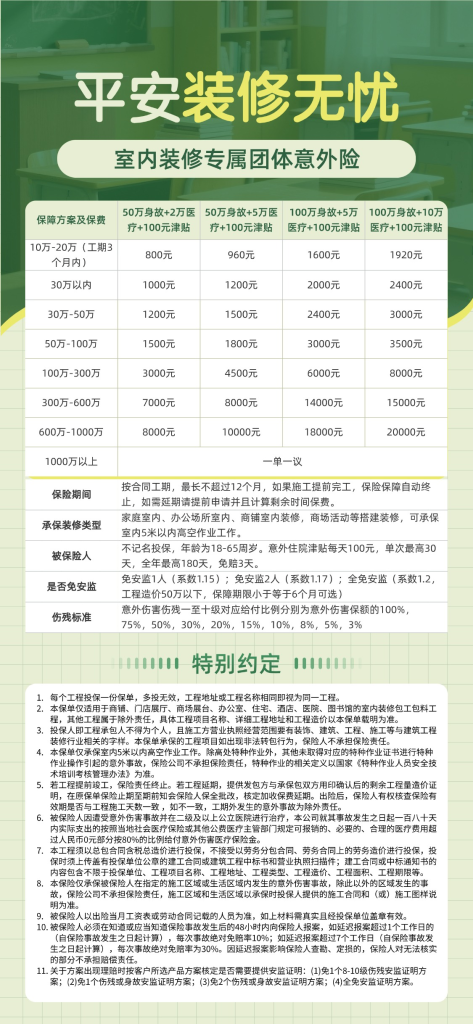 2.本保单仅适用于商铺、门店展厅、商场展台、办公室、住宅、酒店、医院、图书馆的室内装修包工包料工程,其他工程属于除外责任,具体工程项目名称、详细工程地址和工程造价以本保单载明为准。